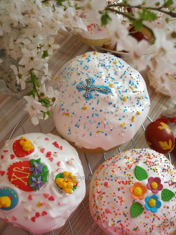 Ещё тёплыми покрыть пасхальные куличи глазурью, украсить по своему вкусу.