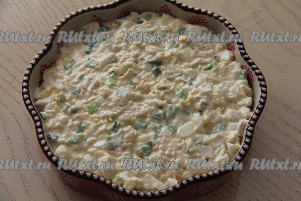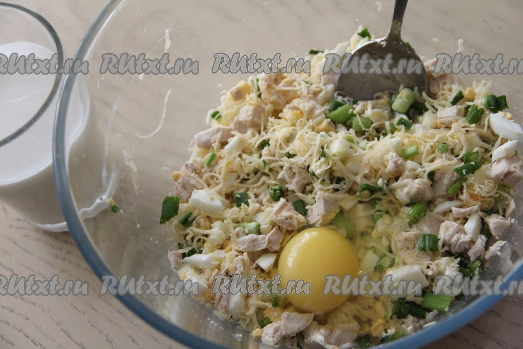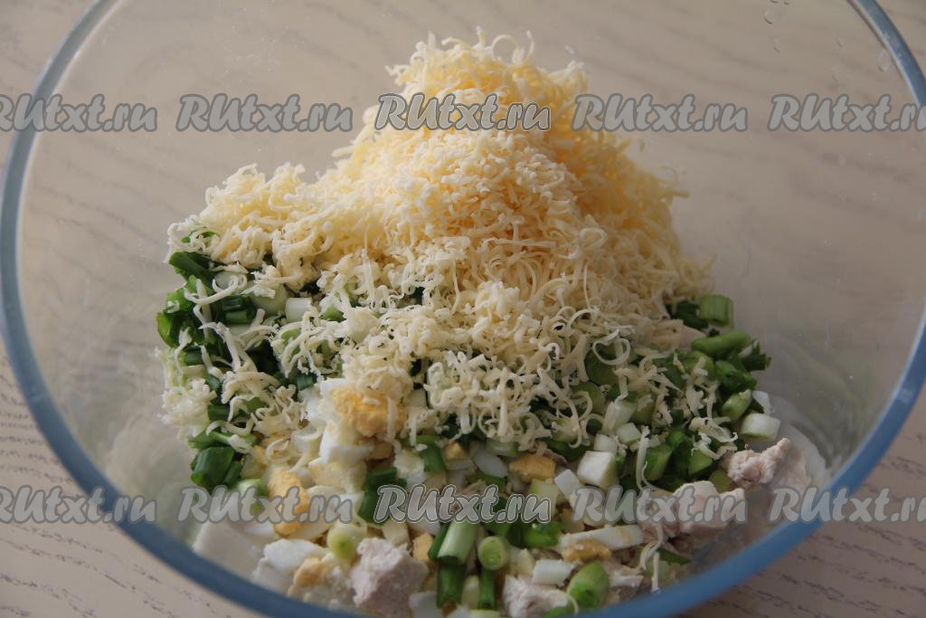 Зелёный лук промыть водой и мелко нарезать. В миску с курицей и яйцами выложить зелёный лук и сыр, натёртый на мелкой тёрке, перемешать.