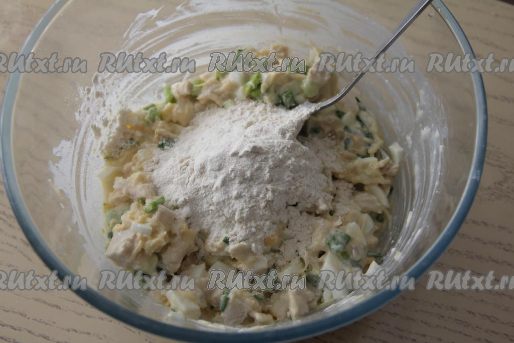 Всыпать муку. Перемешать массу ложкой, она получится вязкой, не жидкой.
