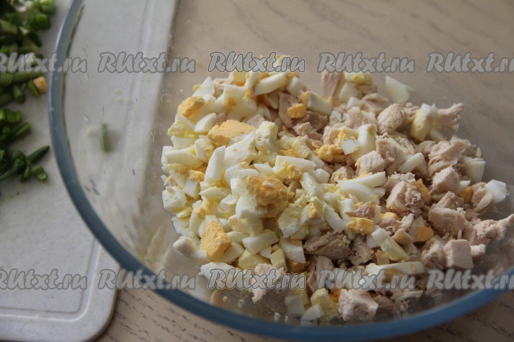 Куриное мясо (у меня - филе) отварить до готовности (в течение минут 25-30 после закипания воды), после этого остудить и нарезать на мелкие кубики. 3 яйца предварительно сварить вкрутую (на отваривание с момента закипания воды потребуется минут 9-10), затем остудить их, почистить и нарезать на мелкие кубики. Соединить в миске нарезанные яйца и куриное мясо.