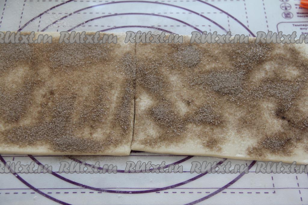 Слоёное тесто предварительно разморозить при комнатной температуре. Сахар соединить с корицей и перемешать.