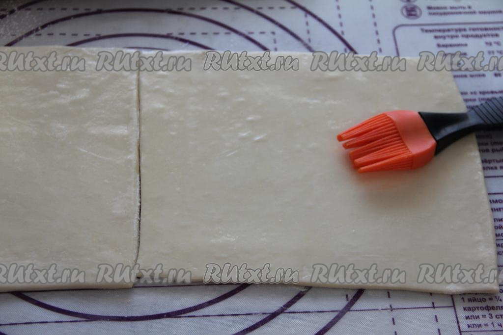 Свернуть два пласта слоёного теста, начиная с узкой стороны, в один рулет. Не нужно плотно сворачивать тесто. Рулет должен получиться не плотным.