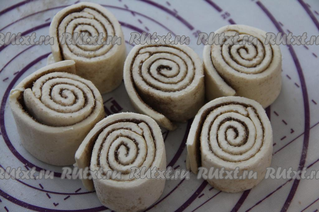 Нарезать рулет на кусочки. У меня получилось 6 булочек. Я разрезала тесто ниткой, так оно меньше приминается при разрезании.