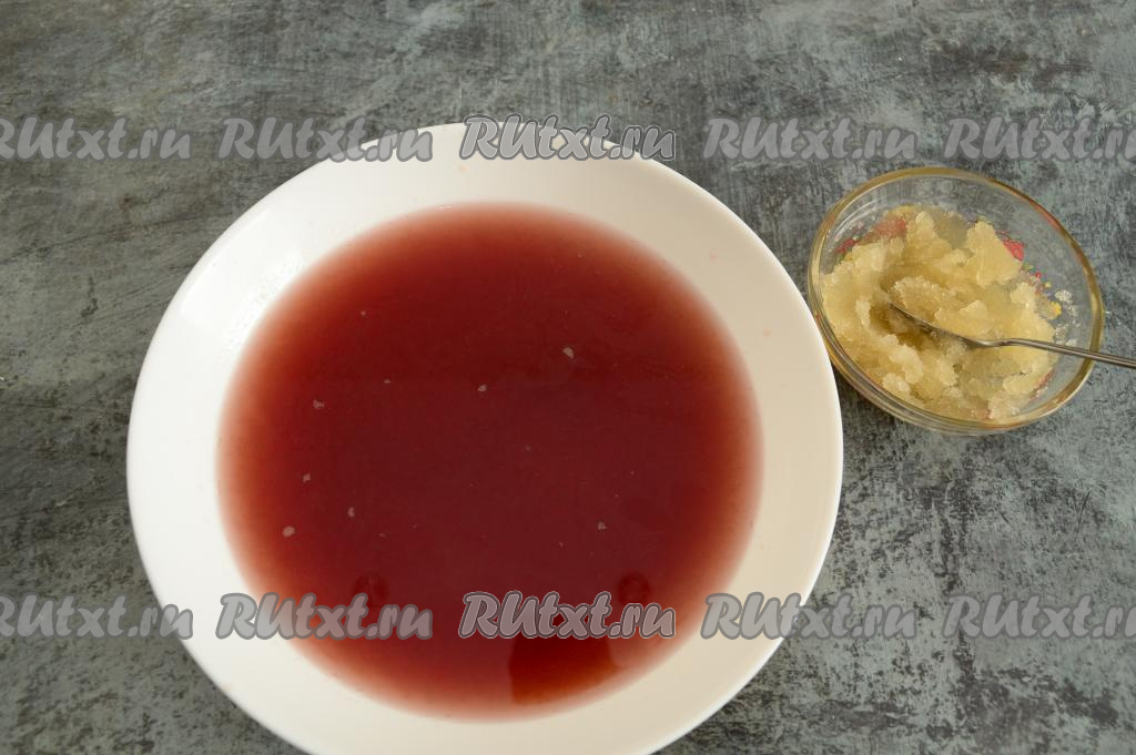 В горячий процеженный компот (у меня температура компота обычно 60-70 градусов) добавить набухший желатин, тщательно перемешать, чтобы все кристаллики желатина растворились. При желании смесь малинового компота и желатина можно процедить через сито, чтобы убедиться, что не осталось не растворившегося желатина.