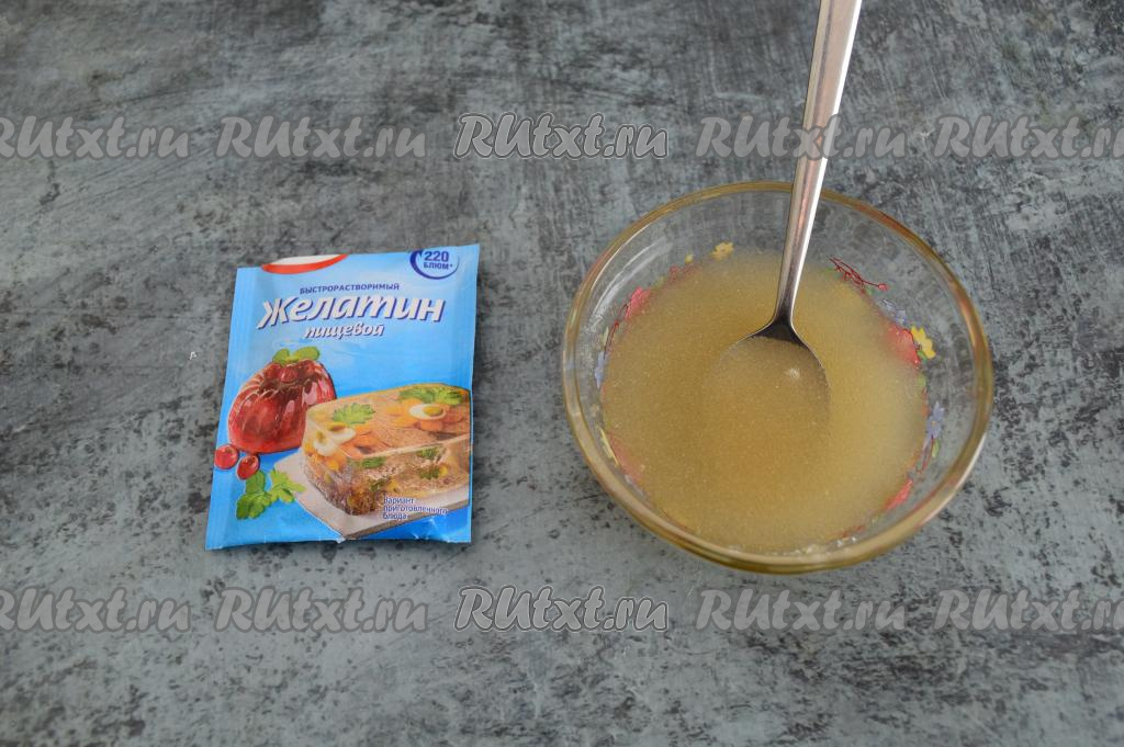 Желатин (у меня - быстрорастворимый желатин) переложить в небольшую ёмкость, залить 50 миллилитрами воды комнатной температуры, перемешать и оставить для набухания минут на 10. Желатин бывает разным, поэтому обязательно ознакомьтесь с инструкцией на упаковке желатина, который вы используете, возможно, его нужно будет замачивать для набухания на более длительное время.