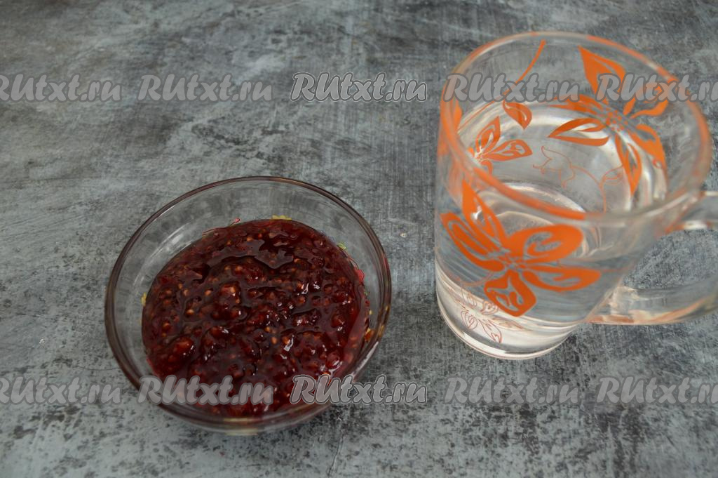 Отмерить нужное количество малинового варенья и 250 миллилитров воды.
