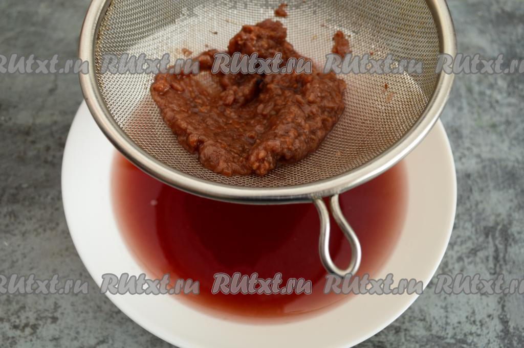 Снять получившийся малиновый компот с огня, дать ему немного остыть, затем процедить через сито. Семечки и жмых, оставшиеся в сите, выбросить, они нам не понадобятся.