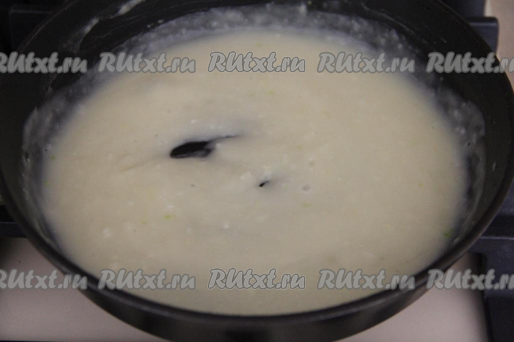 На сковороду с масляно-мучной смесью влить воду, тщательно перемешать, должна получиться однородная масса.