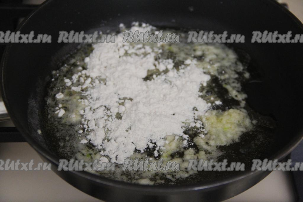 Добавить муку и обжарить, постоянно помешивая, 1 минуту.