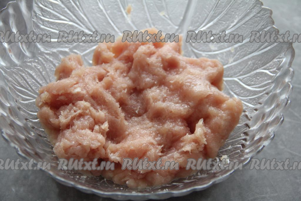 Для получения фарша пропустить мясо (я взяла куриное филе) через мясорубку, посолить, поперчить фарш, хорошо вымесить.