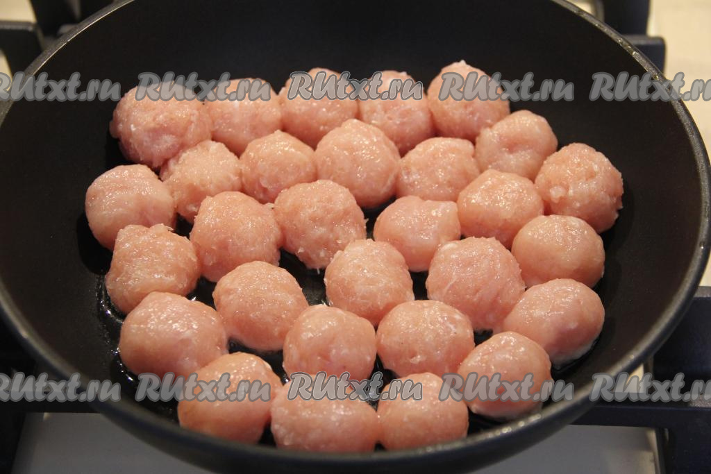 Сформировать из фарша небольшие шарики (фрикадельки), выложить их в один слой в сковороду, уже разогретую с растительным маслом. Жарить фрикадельки на среднем огне, периодически перемешивая, минут 15.