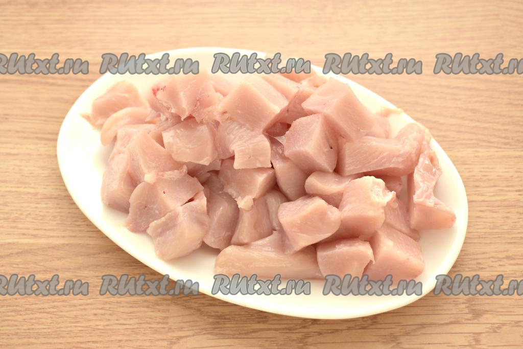 Для того чтобы куриное мясо лучше перекручивалось в мясорубке, его можно заранее слегка подморозить в морозилке (или, если оно было заморожено, размораживать не полностью). Нарезаем мясо на небольшие кусочки.