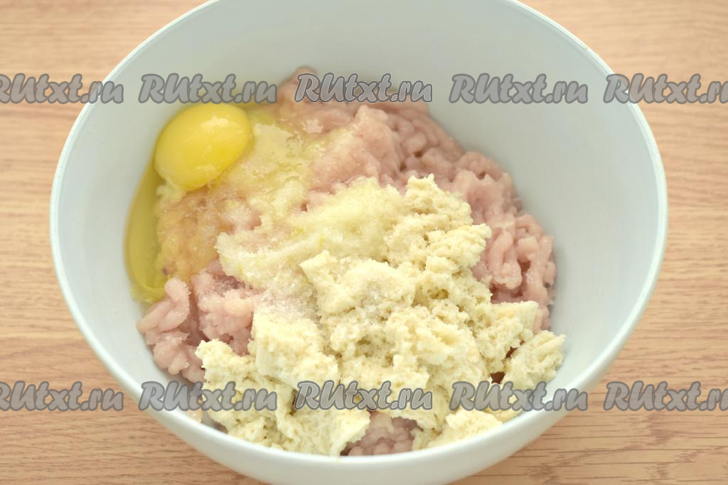 Далее к фаршу добавляем сырое куриное яйцо, размокший хлеб, отжатый от лишней жидкости, и соль.