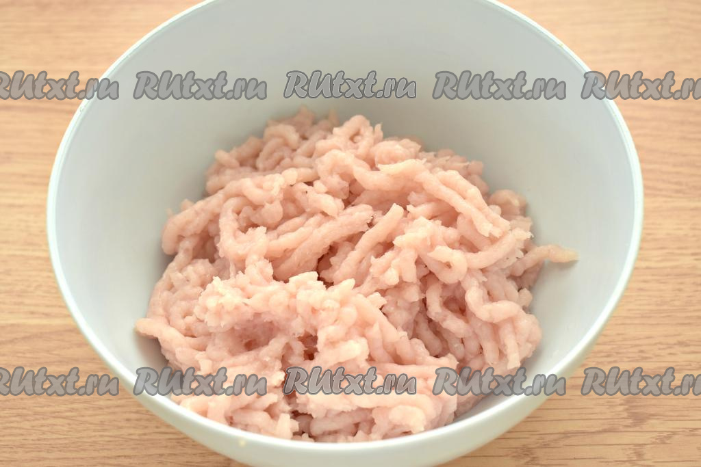 Пропускаем кусочки куриного мяса через мясорубку и выкладываем получившийся фарш в миску.