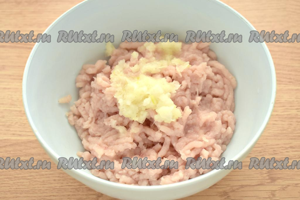 Очищенную луковицу пропускаем через мясорубку (или натираем на крупной тёрке), перекладываем к фаршу.