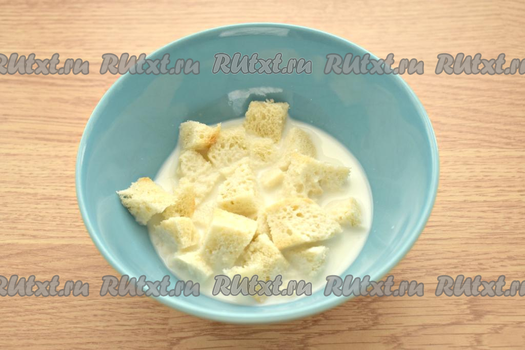 Ломтики батона без корочек разламываем на кусочки, кладём в глубокую тарелку, заливаем молоком, слегка приминаем, чтобы хлеб был полностью в молоке, и оставляем минут на 5.