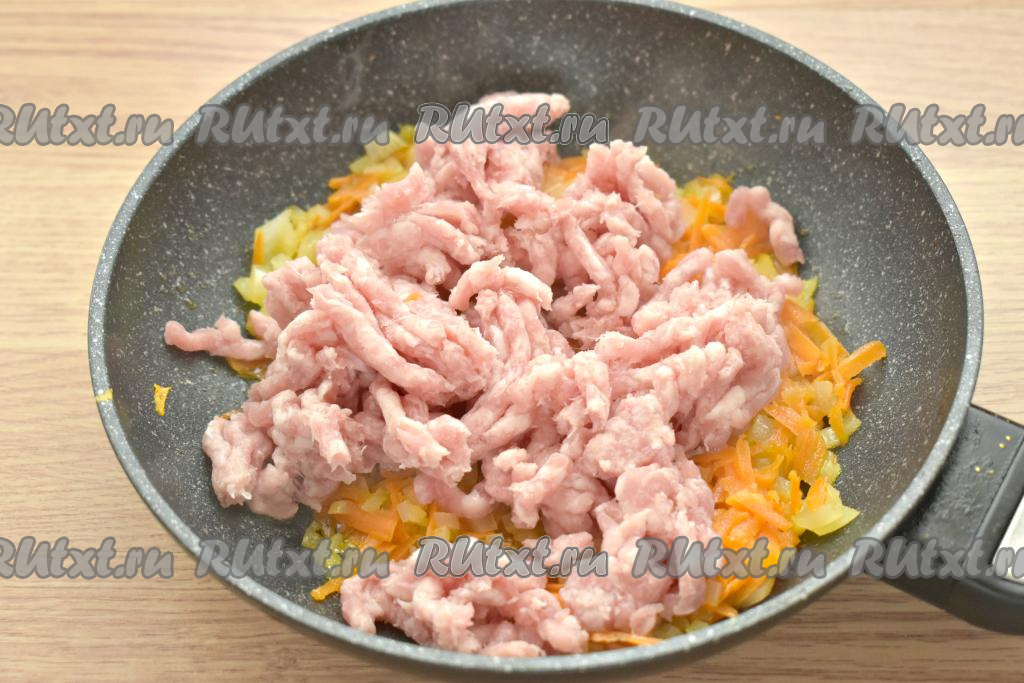 Добавляем в сковороду мясной фарш и обжариваем его с овощами 5 минут, постоянно разбивая лопаткой комочки мяса.
