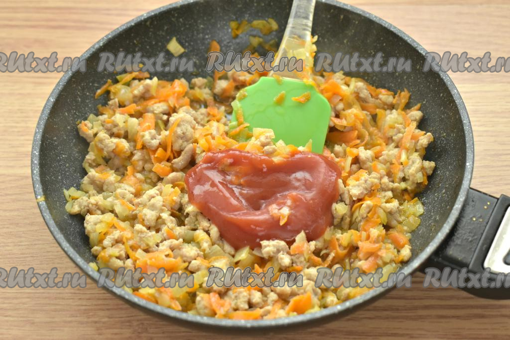 К обжаренному фаршу и овощам добавляем томатный соус, перемешиваем, обжариваем ещё 2 минуты.
