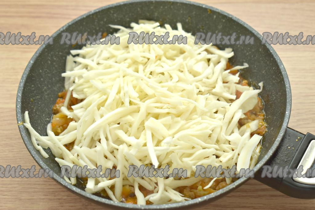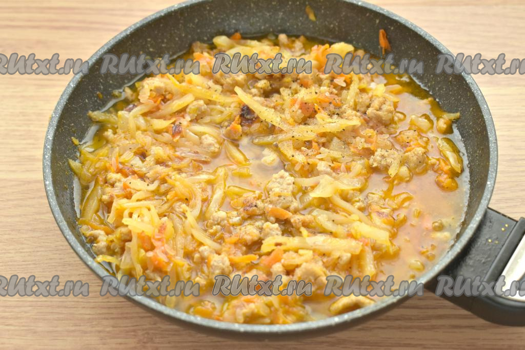 Тушим капусту с фаршем и рисом, накрыв сковороду крышкой, 20 минут.