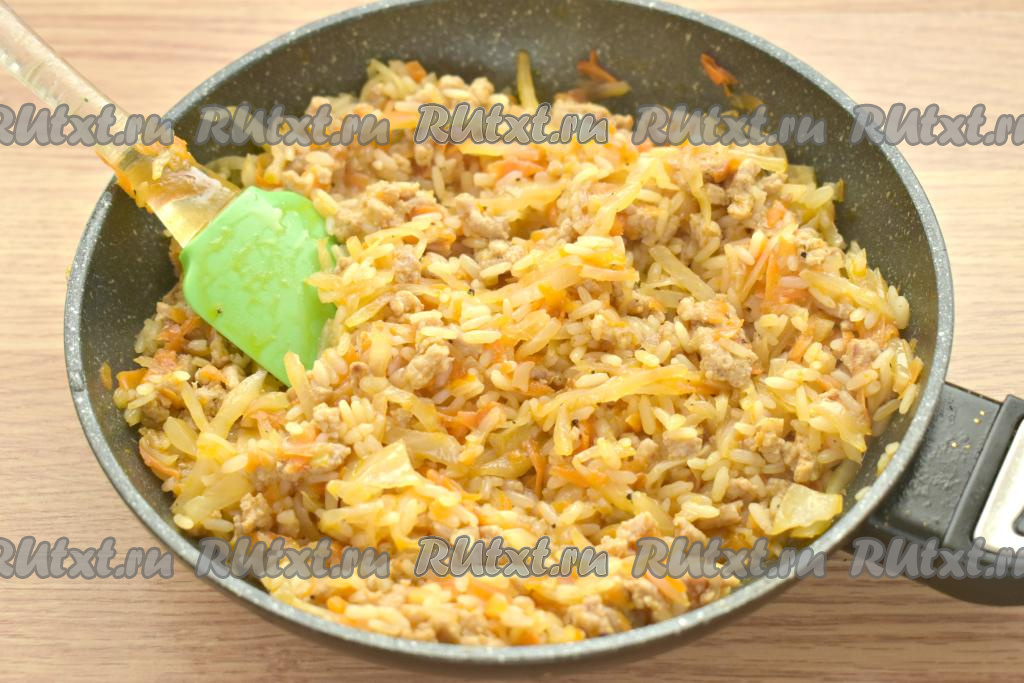Рис промываем водой, лишней жидкости даём стечь. После того как капуста с фаршем обжарятся 8-10 минут, добавляем в сковороду рис, перемешиваем, готовим 5 минут.