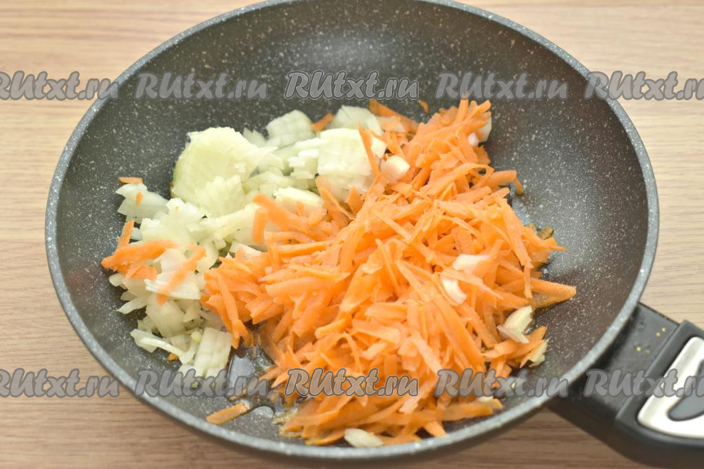 Очищаем морковку с луком. Натираем на крупной тёрке морковь, нарезаем лук достаточно мелко. В сковороде разогреваем растительное масло, выкладываем морковку и лук, перемешиваем. Периодически перемешивая, обжариваем овощи 5 минут на среднем огне.