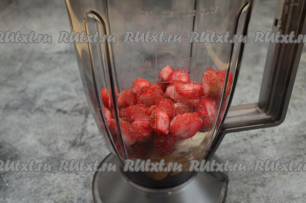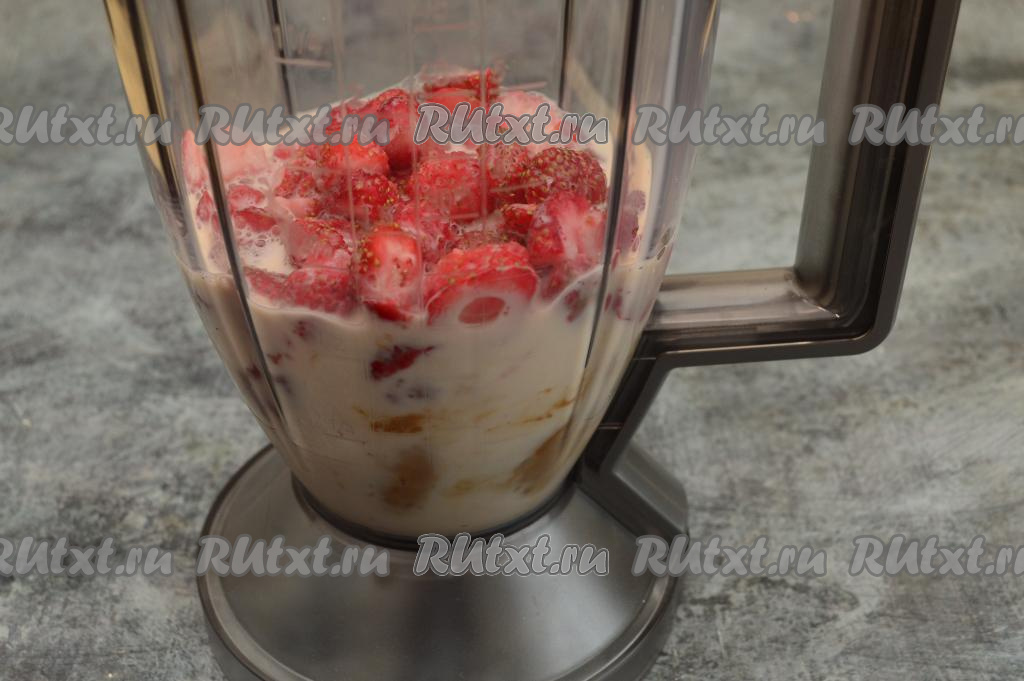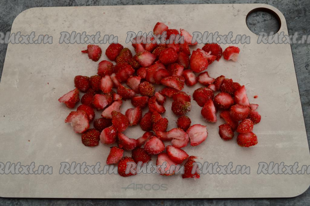 Замороженную клубнику нужно немного разморозить. Пробивать полностью замороженную клубнику блендером не рекомендую, будет большая нагрузка на двигатель, так как замороженные крупные ягоды твёрдые, как лёд. Слегка размороженные ягоды разрезать на части (если слегка размороженную клубнику пробивать блендером целиком, у вас коктейль получится не однородным). Свежую клубнику можно на части не резать.