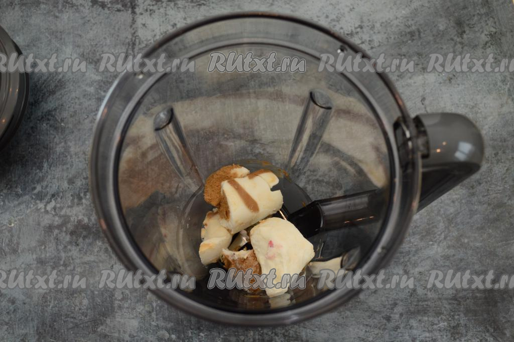 В чашу блендера выложить мороженое (я разделила его на части). У меня было мороженое в вафельном стаканчике, который я предварительно убрала. Взбивала ингредиенты я в коктейльном блендере, но можно взбивать и обычным погружным блендером. Но, конечно же, в коктейльном блендере готовить удобнее, ну а качество в любом случае получится примерно одинаковым.