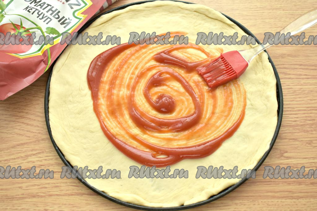 Тесто делим на 2 части (будем готовить 2 пиццы). Вначале на присыпанной мукой поверхности раскатываем одну часть теста в круг диаметром 25 сантиметров. Форму для выпечки (или противень) смазываем растительным маслом (или застилаем пергаментом), выкладываем раскатанное тесто, формируя небольшие бортики, и смазываем его 1-1,5 столовыми ложками кетчупа.