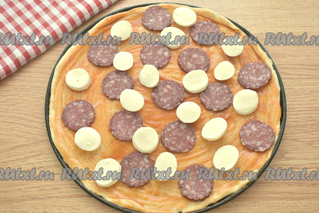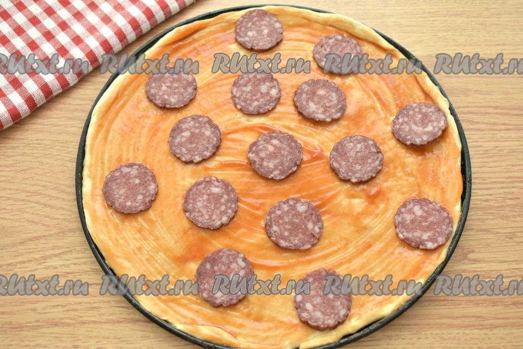 Колбасу нарезаем на тонкие кружки. Половину нарезанной колбасы выкладываем на тесто.