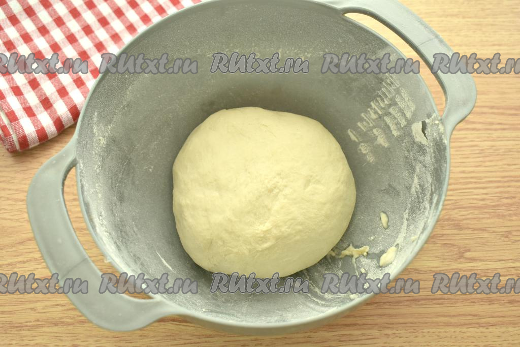 Дрожжевое тесто для пиццы должно получиться мягким, не липнущим к рукам. Накрываем миску с тестом полотенцем и оставляем на 40-50 минут (до увеличения в объёме раза в 2) в тёплом месте. Обминаем поднявшееся тесто.