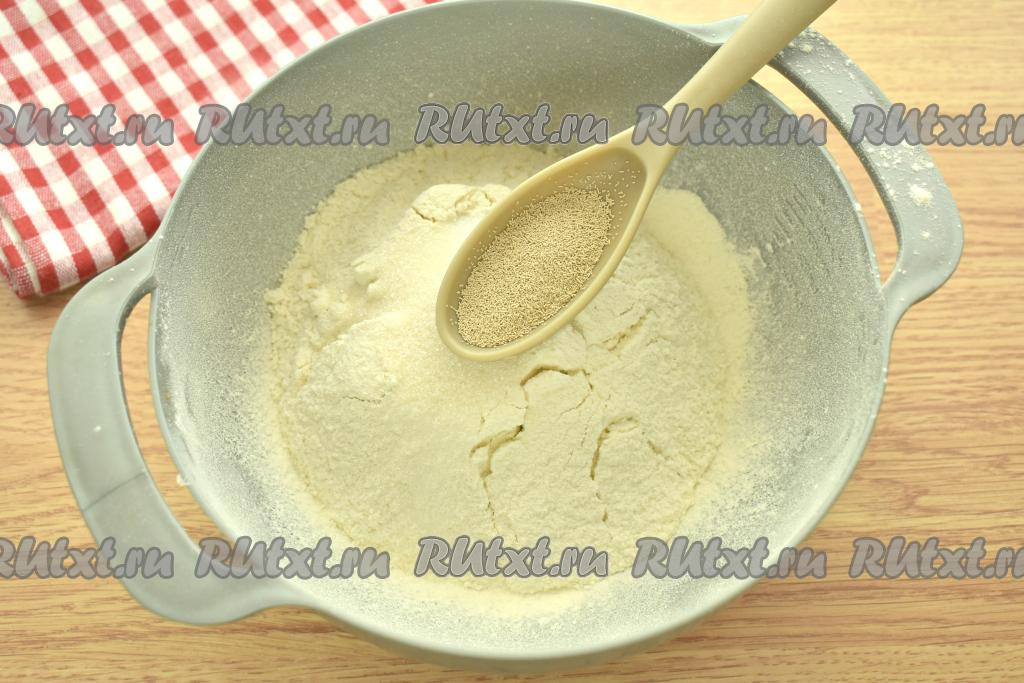 В глубокую миску просеиваем пшеничную муку, добавляем сахар, соль и сухие быстродействующие дрожжи, перемешиваем.