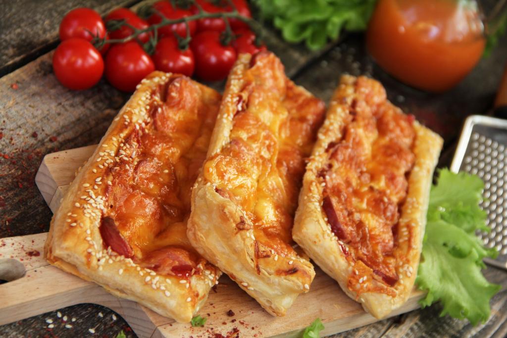 Закусочные слойки с начинкой из сосисок и сыра достать из духовки, переложить на тарелку, дать немного остыть и можно подавать к столу. Такая быстрая выпечка из слоёного теста станет и отличным дополнением к чаю, и сытным перекусом в течение дня.