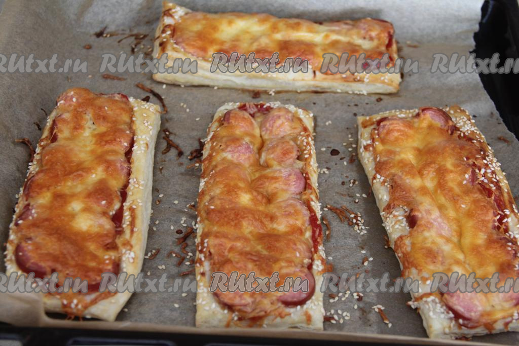 Присыпать слойки натёртым сыром, по желанию, посыпать их кунжутом и поставить в разогретую духовку. Слойки с сосисками и сыром выпекать минут 25 при температуре 200 градусов.