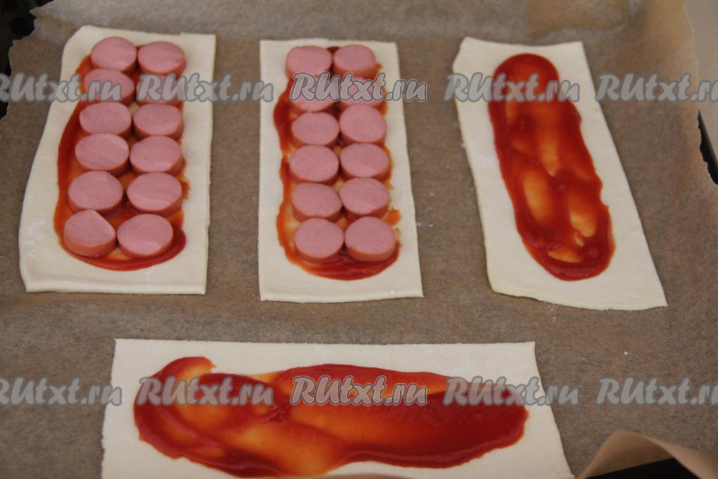 Прямоугольные заготовки теста переложить на противень, застеленный ковриком (или пергаментом) для выпечки. Смазать середину каждой заготовки теста кетчупом, отступив от краёв по 1-2 сантиметра. Сосиски нарезать на кружочки толщиной 0,5 сантиметра и выложить на кетчуп. Смазать свободную часть теста взбитым желтком.
