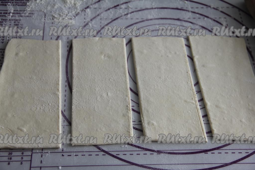 Пласт слоёного теста на присыпанной мукой поверхности слегка раскатать скалкой и разрезать на 4 прямоугольника.