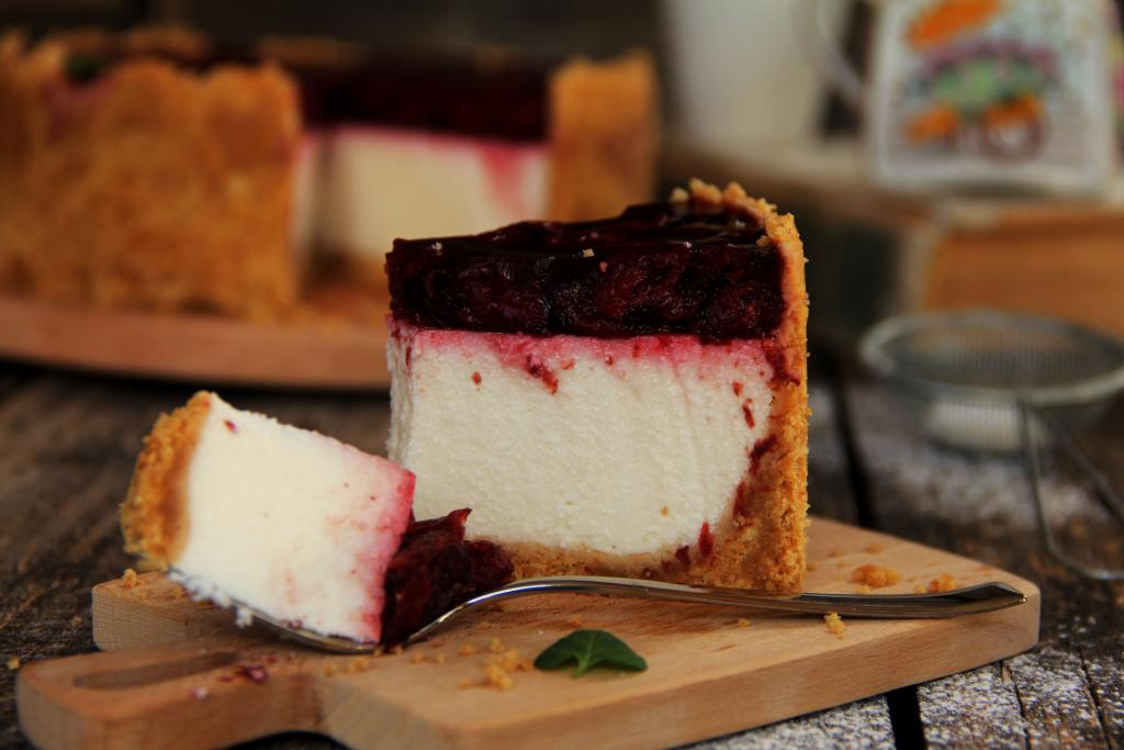 Творожный чизкейк, приготовленный с вишней без выпечки, прекрасно держит форму, отлично режется. Посмотрите, какой красивый разрез у этого десерта.
