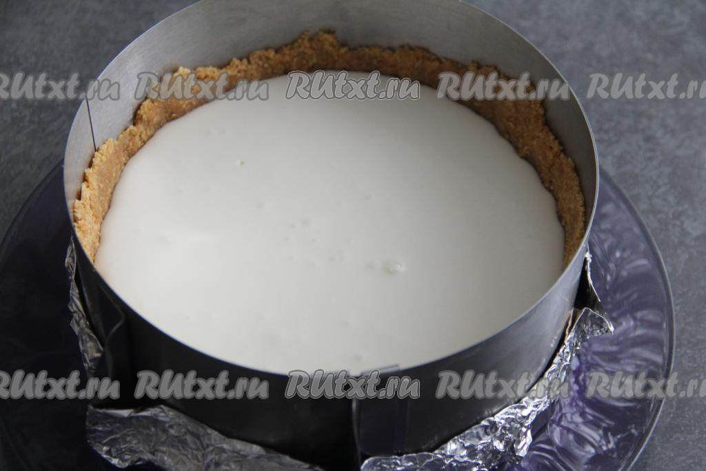 Получившуюся массу выложить в форму для выпечки диаметром 18 сантиметров (я взяла кулинарное кольцо и сформировала дно из фольги, сложенной в несколько слоёв). Сформировать из печенья с маслом основу чизкейка, тщательно утрамбовывая дно и формируя высокий бортик. Убрать форму с основой в холодильник на время, пока будем заниматься творожной начинкой чизкейка.