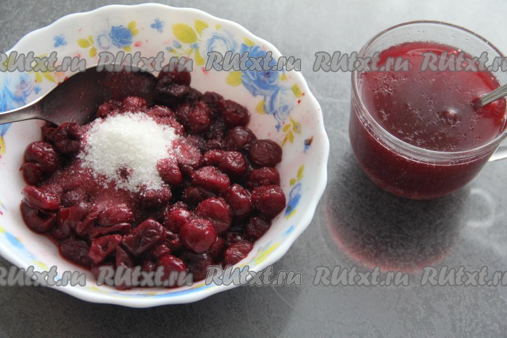 Когда творожный слой застынет, можно начать заниматься ягодной прослойкой. Измерить сок, который мы слили с размороженной (или свежей) вишни. Нам потребует 150 миллилитров жидкости, если сока получилось меньше, долейте холодную кипячёную воду до нужного объёма. К 150 миллилитрам вишнёвого сока (или сока, смешанного с водой) добавить 10 грамм желатина, перемешать и оставить набухать минут на 10-15. К размороженной (или свежей) вишне добавить 1 столовую ложку сахара, аккуратно перемешать и оставить минут на 10, чтобы сахар растворился.