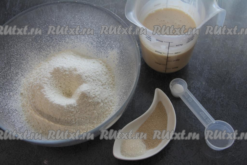 В миску просеять муку, добавить соль, сахар и дрожжи, перемешать сухие ингредиенты. Кефир подогреть примерно до 40 градусов.