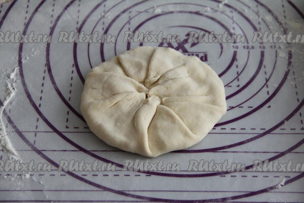 Тесто обмять и разделить на 6 равных частей. Начинку тоже зрительно разделить на 6 частей. Каждую часть теста раскатать на присыпанной мукой поверхности в достаточно тонкую лепёшку. В центр лепёшки выложить одну часть картофельно-луковой начинки.