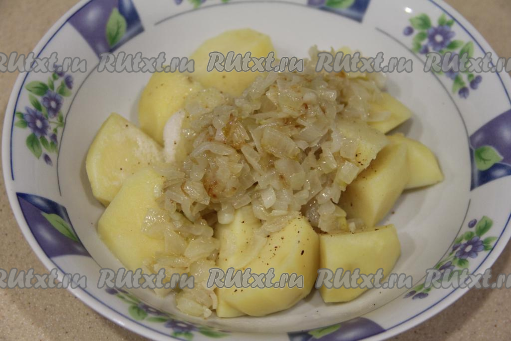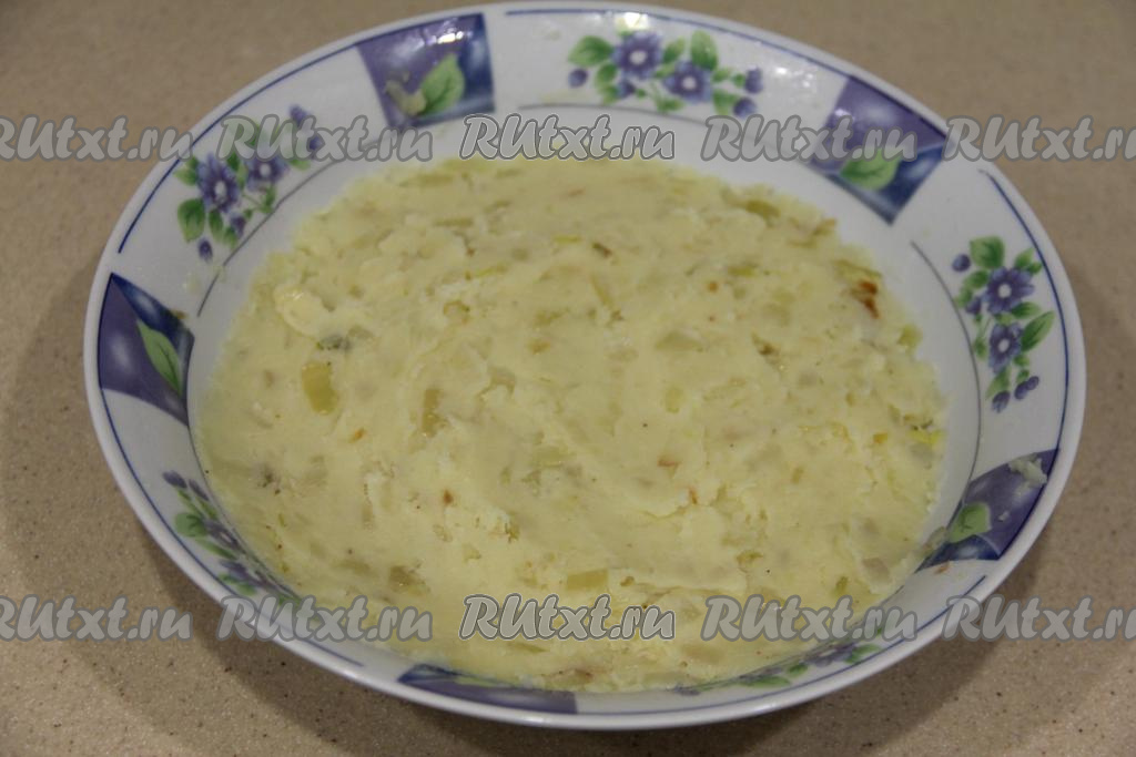 Размять картошку с луком с помощью толкушки в однородное пюре, дать остыть.