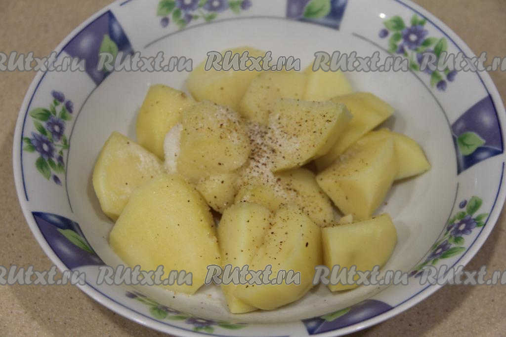 Горячий картофель переложить в миску, посолить его, поперчить.