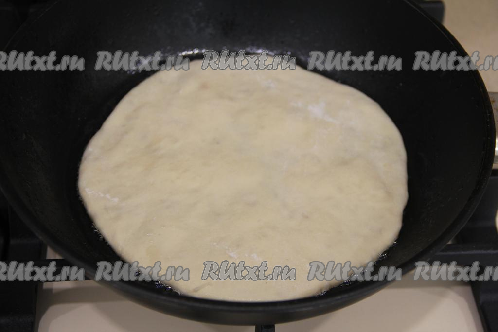 В сковороду влить растительное масло, хорошо разогреть и только после этого выложить лепёшку.