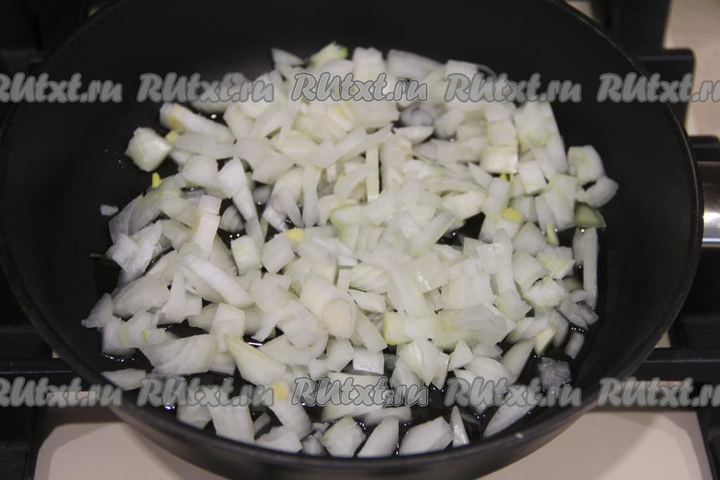 Пока варится картофель, выложить в сковороду, прогретую с растительным маслом, очищенную и нарезанную мелко луковицу, обжарить её до золотистого цвета на среднем огне, иногда помешивая.