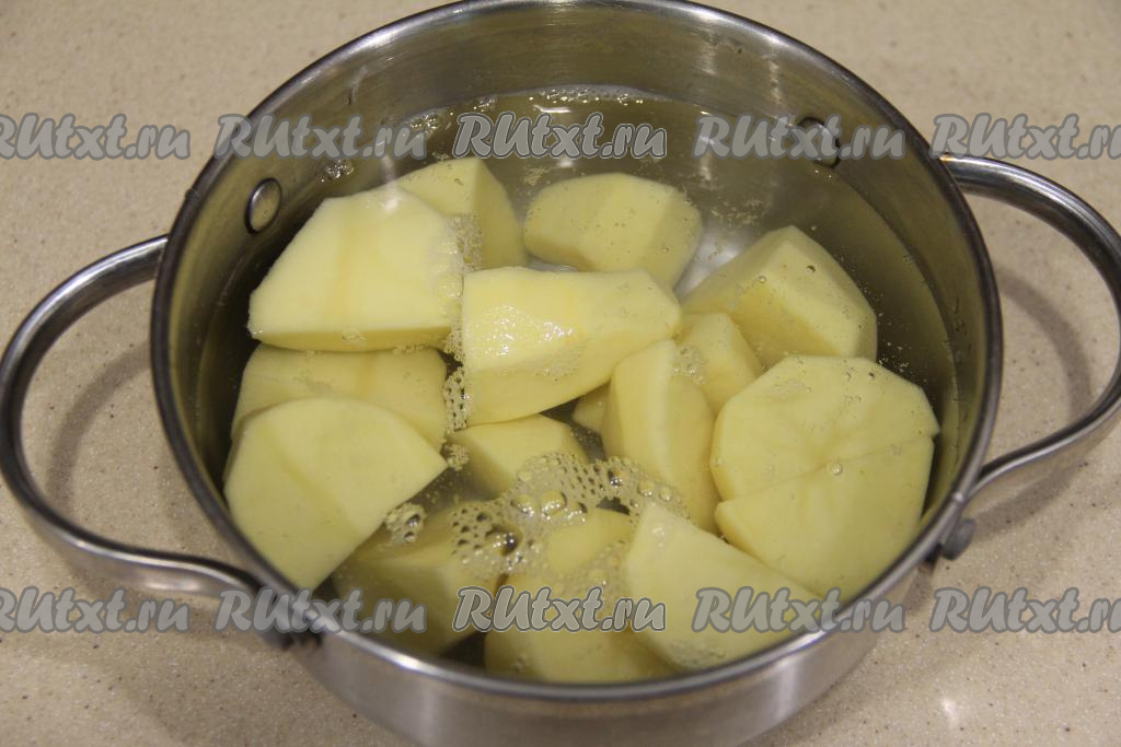 Пока тесто отдыхает, приготовим картофельную начинку для лепёшек. Для этого очищенную картошку, нарезанную на части, нужно выложить в кастрюлю, залить полностью водой и отварить с момента закипания воды в течение минут 25 (до готовности картофеля), затем всю воду слить.