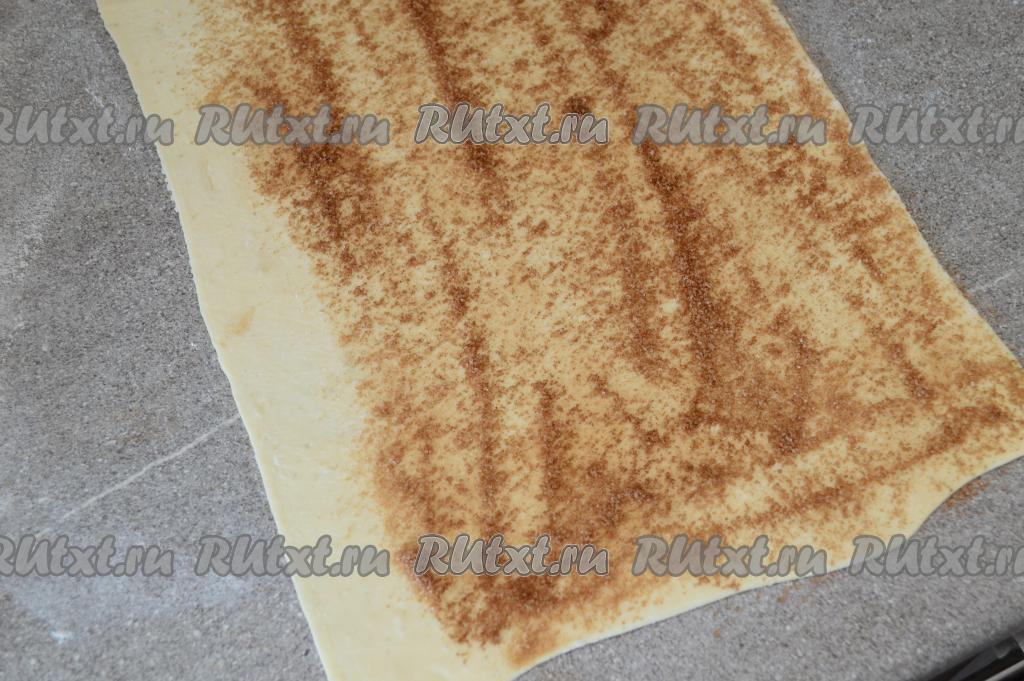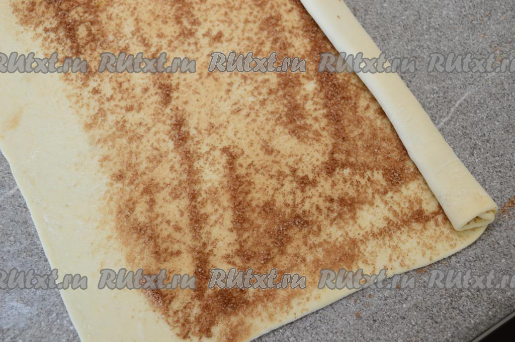 На раскатанный пласт слоёного теста равномерно нанести смесь сахара и корицы, отступив 2 сантиметра от одного длинного края теста, как на фото.