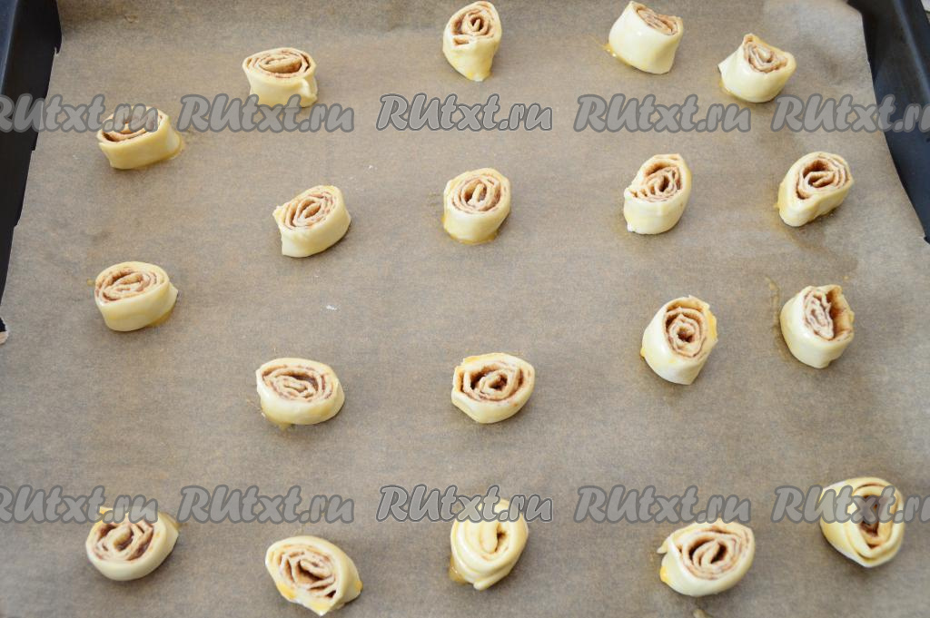 Выложить нарезанные рулетики (у меня получилось 19 штук) на противень, застеленный пергаментом для выпечки, на расстоянии друг от друга (слойки увеличатся в объёме в процессе выпечки). Я использую силиконизированный пергамент, к нему выпечка не пристаёт, если не уверены в качестве пергамента для выпечки, тогда перед выкладываем заготовок слоек, можно его смазать тонким слоем растительного масла. Яйцо взбить в небольшой ёмкости вилкой. Каждый рулетик смазать сверху взбитым яйцом.