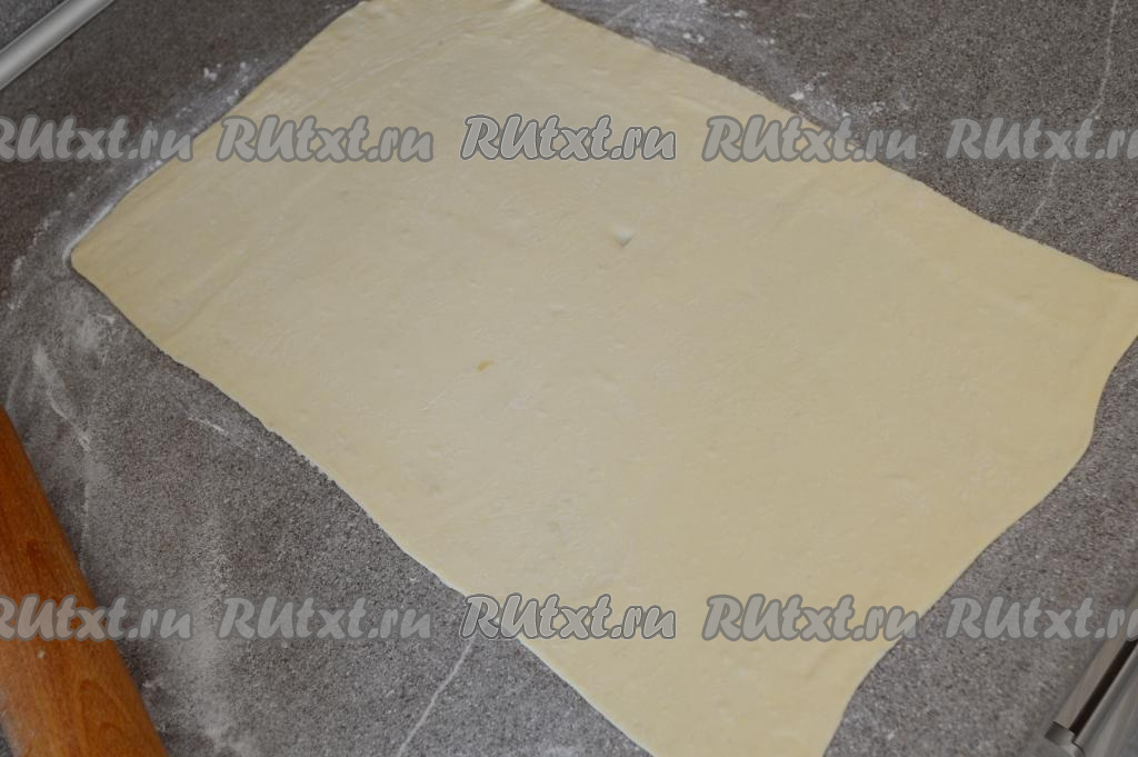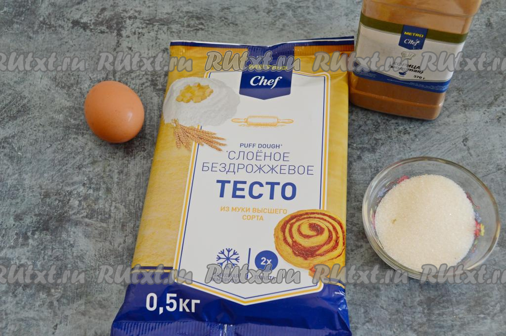 Подготовить продукты. Слоёное тесто можно взять дрожжевое или бездрожжевое. У меня было бездрожжевое. Тесто заранее достать из морозилки и разморозить при комнатной температуре.