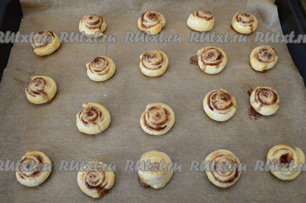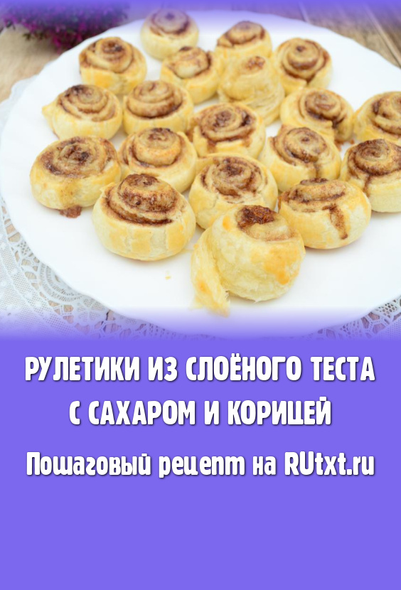 Рулетики с сахаром и корицей выпекать в разогретой до 180 градусов духовке минут 20 (до небольшой румяности слоёного теста).