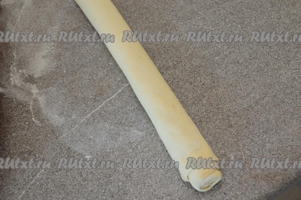 Начиная с длинного края, посыпанного корицей, скрутить пласт теста в рулет.